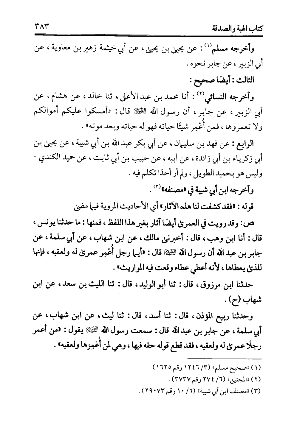 وأخرجه النسائي (¬2): أنا محمَّد بن عبد الأعلى، ثنا خالد، عن هشام، عن أبي الزبير، عن جابر، أن رسول الله -عليه السلام- قال: "أمسكوا عليكم أموالكم ولا تعمروها، فمن أُعْمِر شيئًا حياته فهو له حياته وبعد موته".