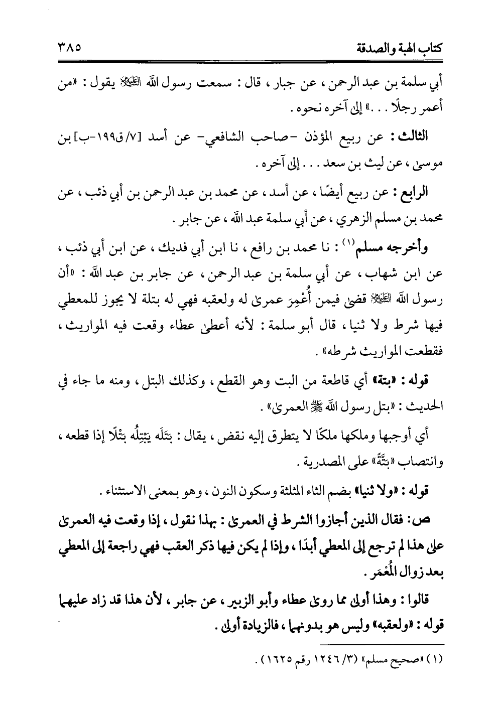 وأخرجه مسلم (¬1): نا محمَّد بن رافع، نا ابن أبي فديك، عن ابن أبي ذئب، عن ابن شهاب، عن أبي سلمة بن عبد الرحمن، عن جابر بن عبد الله: "أن رسول الله -عليه السلام- قضى فيمن أُعْمِرَ عمرى له ولعقبه فهي له بتلة لا يجوز للمعطي فيها شرط ولا ثنيا، قال أبو سلمة: لأنه أعطى عطاء وقعت فيه المواريث، فقطعت المواريث شرطه".