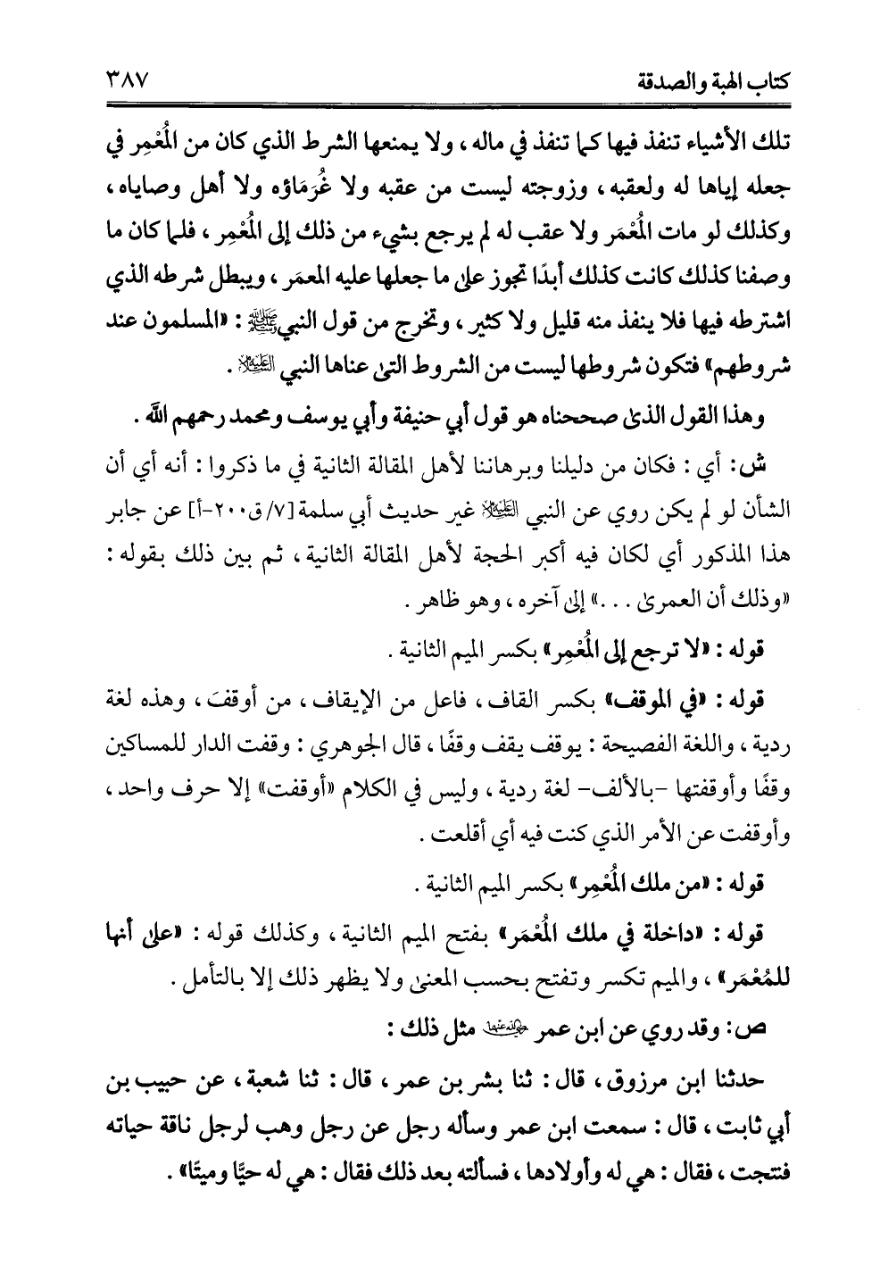 حدثنا ابن مرزوق، قال: ثنا بشر بن عمر، قال: ثنا شعبة، عن حبيب بن أبي ثابت، قال: سمعت ابن عمر وسأله رجل عن رجل وهب لرجل ناقة حياته فنتجت، فقال: هي له وأولادها، فسألته بعد ذلك فقال: هي له حيًّا وميتًا".