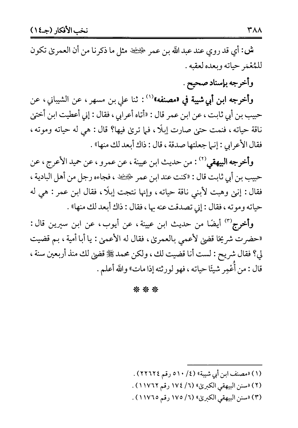 وأخرجه ابن أبي شيبة في "مصنفه" (¬1): ثنا علي بن مسهر، عن الشيباني، عن حبيب بن أبي ثابت، عن ابن عمر قال: "أتاه أعرابي، فقال: إني أعطيت ابن أختي ناقة حياته، فنمت حتى صارت إبلًا، فما ترى فيها؟ قال: هي له حياته وموته، فقال الأعرابي: إنما جعلتها صدقة، قال: ذاك أبعد لك منها".