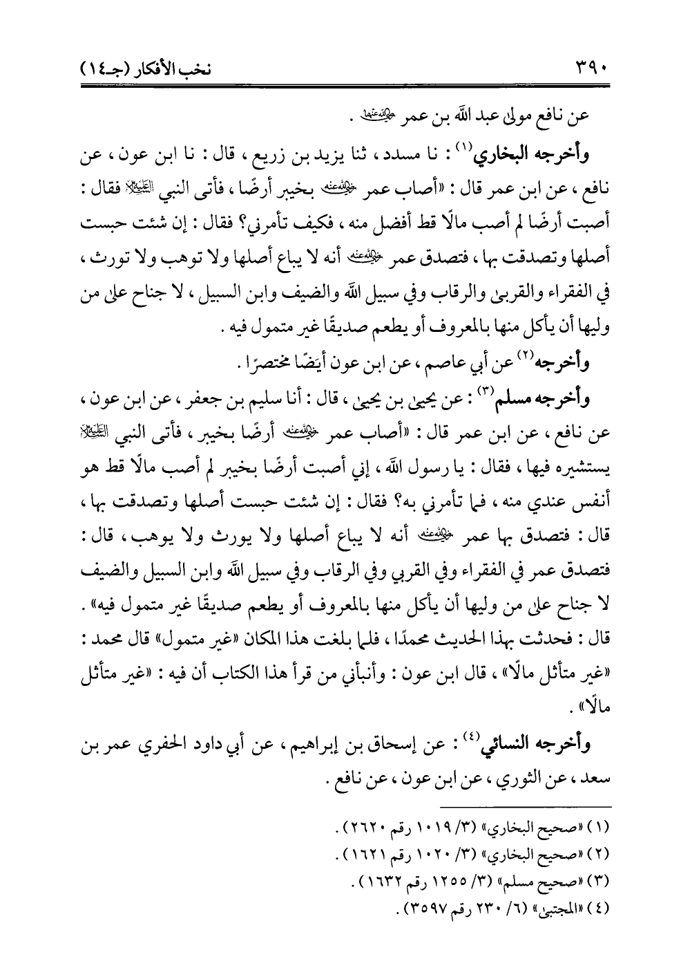 وأخرجه البخاري (¬1): نا مسدد، ثنا يزيد بن زريع، قال: نا ابن عون، عن نافع، عن ابن عمر قال: "أصاب عمر - رضي الله عنه - بخيبر أرضًا، فأتى النبي -عليه السلام- فقال: أصبت أرضًا لم أصب مالًا قط أفضل منه، فكيف تأمرني؟ فقال: إن شئت حبست أصلها وتصدقت بها، فتصدق عمر - رضي الله عنه - أنه لا يباع أصلها ولا توهب ولا تورث، في الفقراء والقربى والرقاب وفي سبيل الله والضيف وابن السبيل، لا جناح على من وليها أن يأكل منها بالمعروف أو يطعم صديقًا غير متمول فيه.