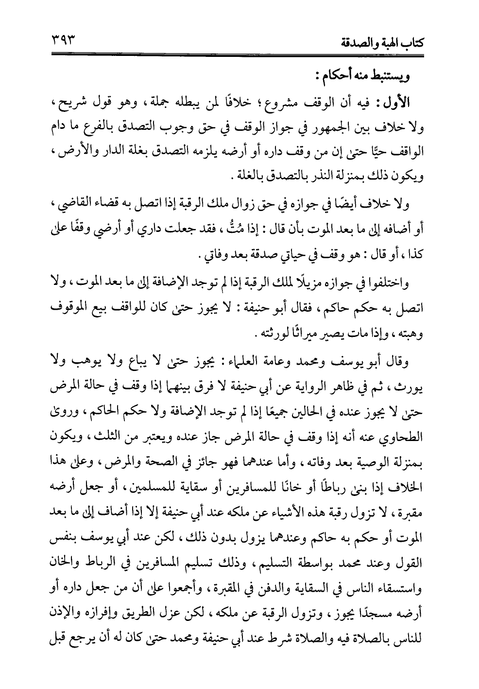 وقال أبو يوسف ومحمد وعامة العلماء: يجوز حتى لا يباع ولا يوهب ولا يورث، ثم في ظاهر الرواية عن أبي حنيفة لا فرق بينهما إذا وقف في حالة المرض حتى لا يجوز عنده في الحالين جميعًا إذا لم توجد الإضافة ولا حكم الحاكم، وروى الطحاوي عنه أنه إذا وقف في حالة المرض جاز عنده ويعتبر من الثلث، ويكون بمنزلة الوصية بعد وفاته، وأما عندهما فهو جائز في الصحة والمرض، وعلى هذا الخلاف إذا بنى رباطًا أو خانًا للمسافرين أو سقاية للمسلمين، أو جعل أرضه مقبرة، لا تزول رقبة هذه الأشياء عن ملكه عند أبي حنيفة إلا إذا أضاف إلى ما بعد الموت أو حكم به حاكم وعندهما يزول بدون ذلك، لكن عند أبي يوسف بنفس القول وعند محمَّد بواسطة التسليم، وذلك تسليم المسافرين في الرباط والخان واستسقاء الناس في السقاية والدفن في المقبرة، وأجمعوا على أن من جعل داره أو أرضه مسجدًا يجوز، وتزول الرقبة عن ملكه، لكن عزل الطريق وإفرازه والإذن للناس بالصلاة فيه والصلاة شرط عند أبي حنيفة ومحمد حتى كان له أن يرجع قبل