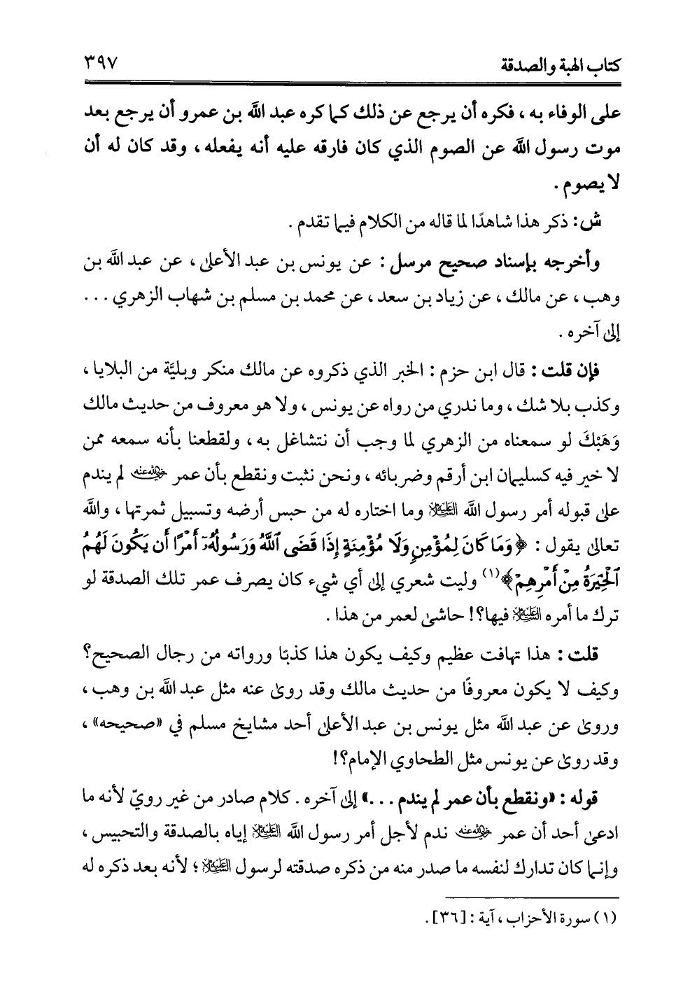 فإن قلت: قال ابن حزم: الخبر الذي ذكروه عن مالك منكر وبليَّة من البلايا، وكذب بلا شك، وما ندري من رواه عن يونس، ولا هو معروف من حديث مالك وَهَبْكَ لو سمعناه من الزهري لما وجب أن نتشاغل به، ولقطعنا بأنه سمعه ممن لا خير فيه كسليمان ابن أرقم وضربائه، ونحن نثبت ونقطع بأن عمر - رضي الله عنه - لم يندم على قبوله أمر رسول الله -عليه السلام- وما اختاره له من حبس أرضه وتسبيل ثمرتها، والله تعالى يقول: {وَمَا كَانَ لِمُؤْمِنٍ وَلَا مُؤْمِنَةٍ إِذَا قَضَى اللَّهُ وَرَسُولُهُ أَمْرًا أَنْ يَكُونَ لَهُمُ الْخِيَرَةُ مِنْ أَمْرِهِمْ} (¬1) وليت شعري إلى أي شيء كان يصرف عمر تلك الصدقة لو ترك ما أمره -عليه السلام- فيها؟! حاشى لعمر من هذا.