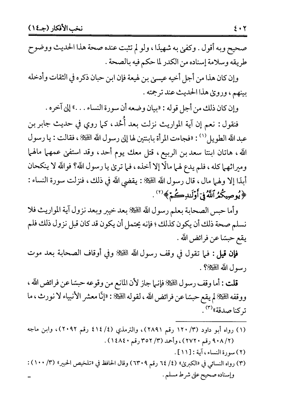 وأما حبس الصحابة بعلم رسول الله -عليه السلام- بعد خيبر وبعد نزول آية المواريث فلا نسلم صحة ذلك أن يكون كذلك؛ فإنه يحتمل أن يكون قد كان قبل نزول ذلك فلم يقع حبسًا عن فرائض الله.