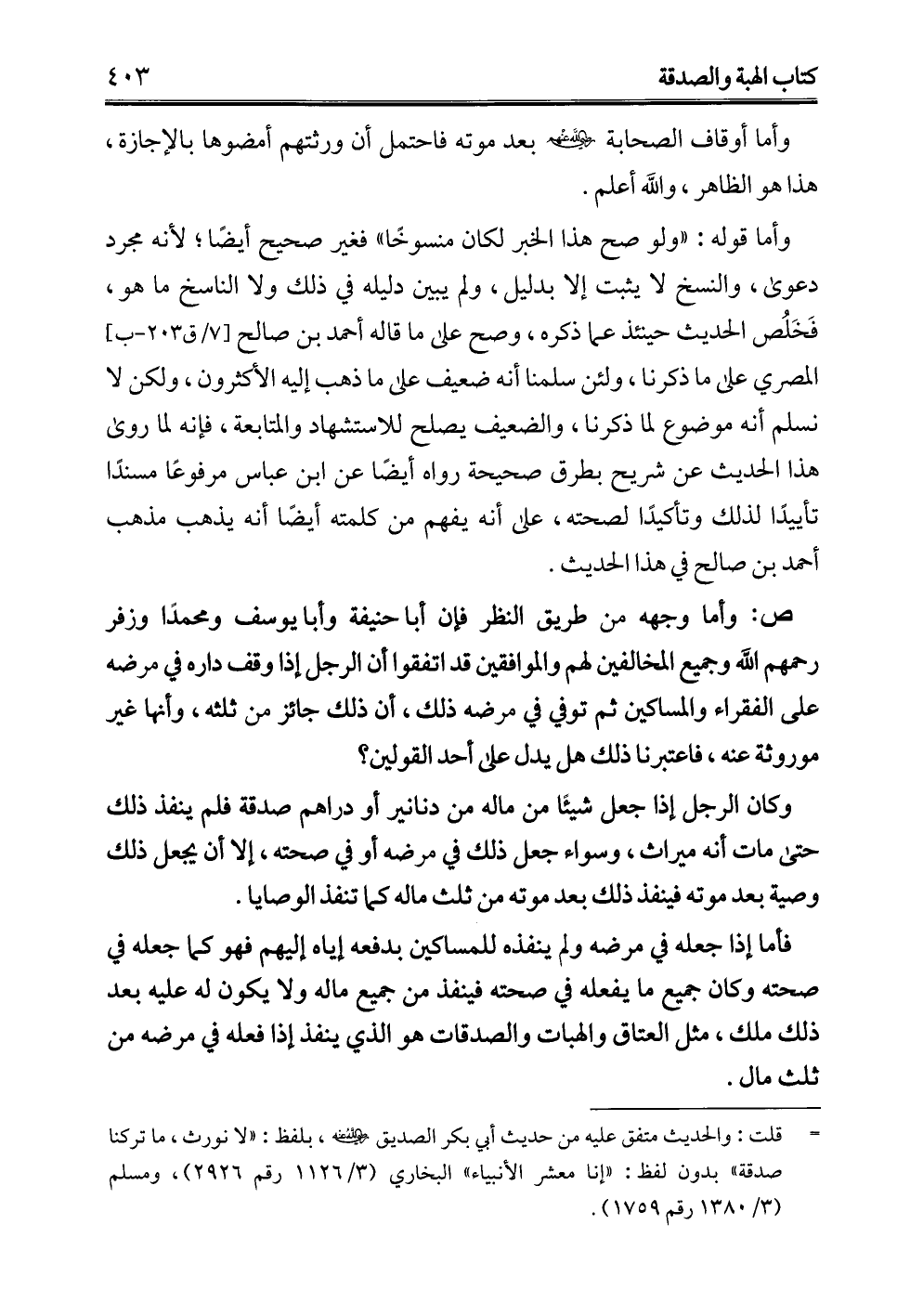ص: وأما وجهه من طريق النظر فإن أبا حنيفة وأبا يوسف ومحمدًا وزفر -رحمهم الله- وجميع المخالفين لهم والموافقين قد اتفقوا أن الرجل إذا وقف داره في مرضه على الفقراء والمساكين ثم توفي في مرضه ذلك، أن ذلك جائز من ثلثه، وأنها غير موروثة عنه، فاعتبرنا ذلك هل يدل على أحد القولين؟