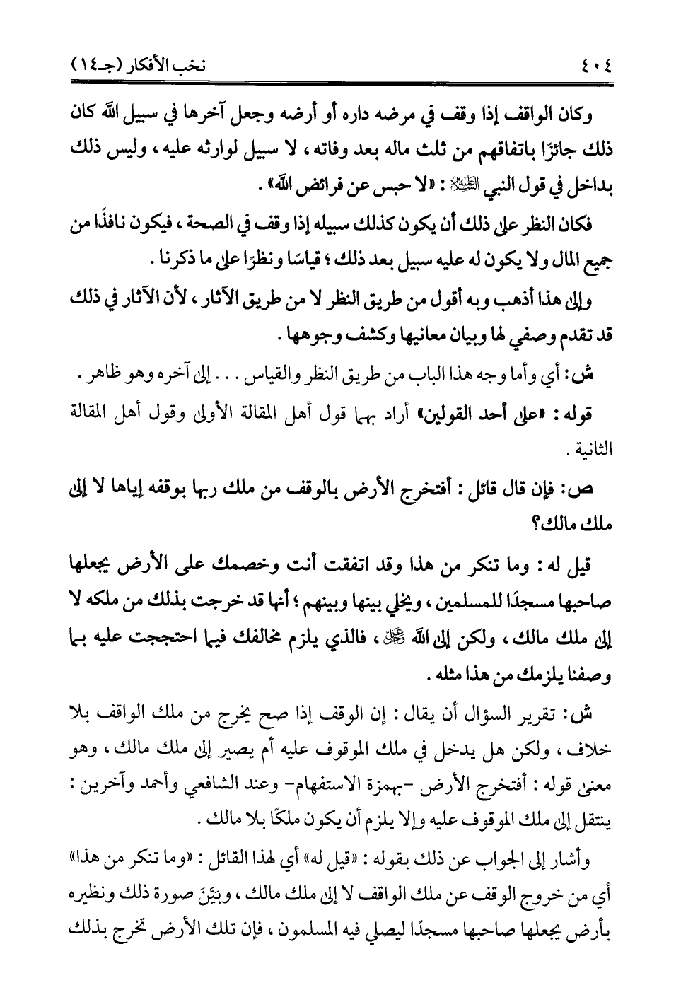 ش: تقرير السؤال أن يقال: إن الوقف إذا صح يخرج من ملك الواقف بلا خلاف، ولكن هل يدخل في ملك الموقوف عليه أم يصير إلى ملك مالك، وهو معنى قوله: أفتخرج الأرض -بهمزة الاستفهام- وعند الشافعي وأحمد وآخرين: ينتقل إلى ملك الموقوف عليه وإلا يلزم أن يكون ملكًا بلا مالك.