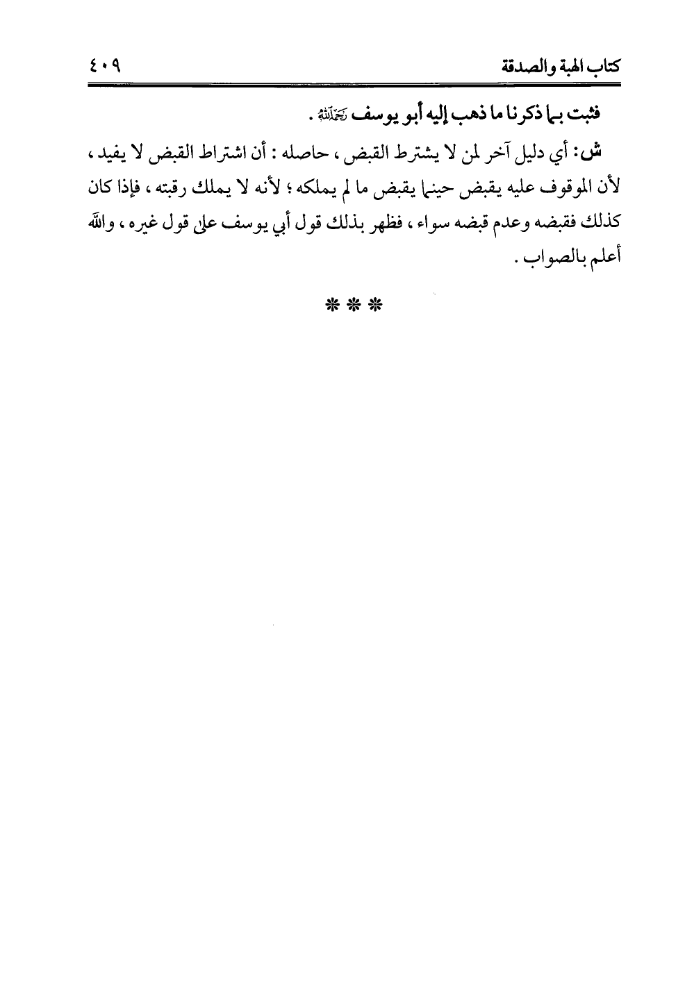 ش: أي دليل آخر لمن لا يشترط القبض، حاصله: أن اشتراط القبض لا يفيد، لأن الموقوف عليه يقبض حينما يقبض ما لم يملكه؛ لأنه لا يملك رقبته، فإذا كان كذلك فقبضه وعدم قبضه سواء، فظهر بذلك قول أبي يوسف على قول غيره، والله أعلم بالصواب.
