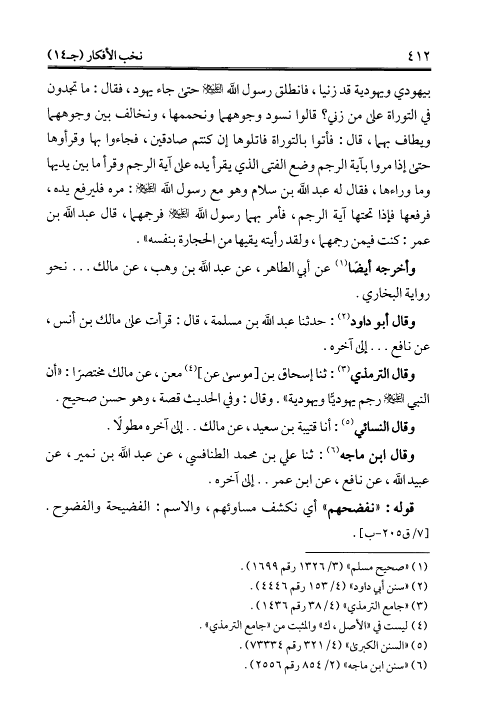 بيهودي ويهودية قد زنيا، فانطلق رسول الله -عليه السلام- حتى جاء يهود، فقال: ما تجدون في التوراة على من زني؟ قالوا نسود وجوههما ونحممها، ونخالف بين وجوههما ويطاف بهما، قال: فأتوا بالتوراة فاتلوها إن كنتم صادقين، فجاءوا بها وقرأوها حتى إذا مروا بآية الرجم وضع الفتى الذي يقرأ يده على آية الرجم وقرأ ما بين يديها وما وراءها، فقال له عبد الله بن سلام وهو مع رسول الله -عليه السلام-: مره فليرفع يده، فرفعها فإذا تحتها آية الرجم، فأمر بهما رسول الله -عليه السلام- فرجمهما، قال عبد الله بن عمر: كنت فيمن رجمهما، ولقد رأيته يقيها من الحجارة بنفسه".