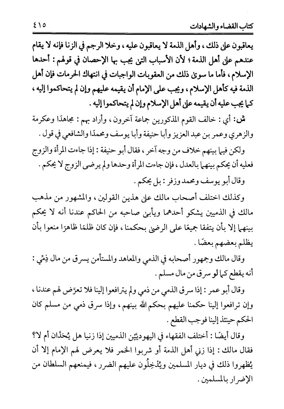 يعاقبون على ذلك، وأهل الذمة لا يعاقبون عليه، وخلا الرجم في الزنا فإنه لا يقام عندهم على أهل الذمة. لأن الأسباب التي يجب بها الإحصان في قولهم: أحدها الإسلام، فأما ما سوى ذلك من العقوبات الواجبات في انتهاك الحرمات فإن أهل الذمة فيه كأهل الإسلام، ويجب على الإمام أن يقيمه عليهم وإن لم يتحاكموا إليه، كما يجب عليه أن يقيمه على أهل الإسلام وإن لم يتحاكموا إليه.
