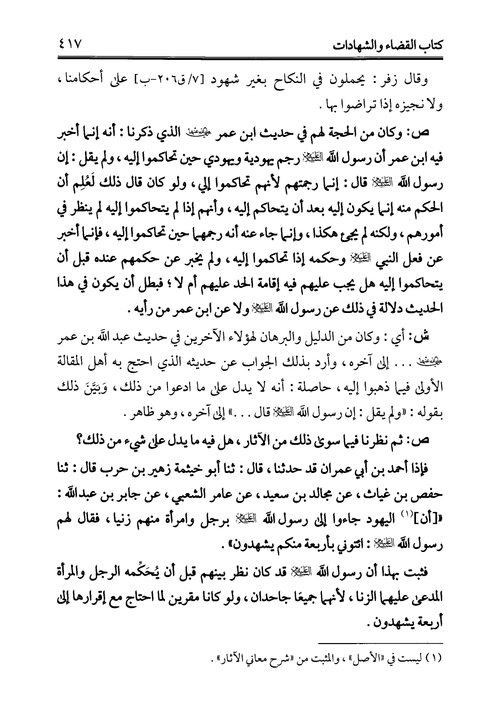 فثبت بهذا أن رسول الله -عليه السلام- قد كان نظر بينهم قبل أن يُحَكِّمه الرجل والمرأة المدعى عليهما الزنا، لأنهما جميعًا جاحدان، ولو كانا مقرين لما احتاج مع إقرارها إلى أربعة يشهدون.