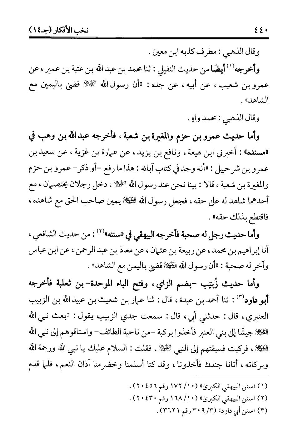 وأما حديث عمرو بن حزم والمغيرة بن شعبة، فأخرجه عبد الله بن وهب في "مسنده": أخبرني ابن لهيعة، ونافع بن يزيد، عن عمارة بن غزية، عن سعيد بن عمرو بن شرحبيل: "أنه وجد في كتاب آبائه: هذا ما رفع -أو ذكر- عمرو بن حزم والمغيرة بن شعبة، قالا: بينا نحن عند رسول الله -عليه السلام-، دخل رجلان يختصمان، مع أحدهما شاهد له على حقه، فجعل رسول الله -عليه السلام- يمين صاحب الحق مع شاهده، فاقتطع بذلك حقه".