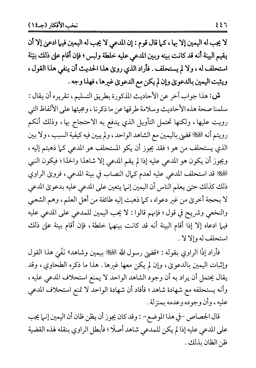 ش: هذا جواب آخر عن الأحاديث المذكورة بطريق التسليم، تقريره أن يقال: سلمنا صحة هذه الأحاديث وسلامة طرقها عن ما ذكرنا، ومجيئها على الألفاظ التي رويت عليها، ولكنها تحتمل التأويل الذي يدفع به الاحتجاج بها، وذلك أنكم رويتم أنه -عليه السلام- قضى باليمين مع الشاهد الواحد، ولم يبين فيه كيفية السبب، ولا بين الذي يستحلف من هو؛ فقد يجوز أن يكون المستحلف هو المدعي كما ذهبتم إليه، ويجوز أن يكون هو المدعي عليه إذا لم يقم المدعي إلا شاهدًا واحدًا؛ فيكون النبي -عليه السلام- قد استحلف المدعي عليه لعدم كمال النصاب في بينة المدعي، فروى الراوي ذلك كذلك حتى يعلم الناس أن اليمين إنما يتعين على المدعي عليه بدعوى المدعي لا بحجة أخرى من غير دعواه، كما ذهبت إليه طائفة من أهل العلم، وهم الشعبي والنخعي وشريح في قول؛ فإنهم قالوا: لا يحب اليمين للمدعي على المدعي عليه فيما ادعاه إلا إذا أقام البينة أنه قد كانت بينهما خلطة، فإن أقام بينة على ذلك استحلف له وإلا لا.