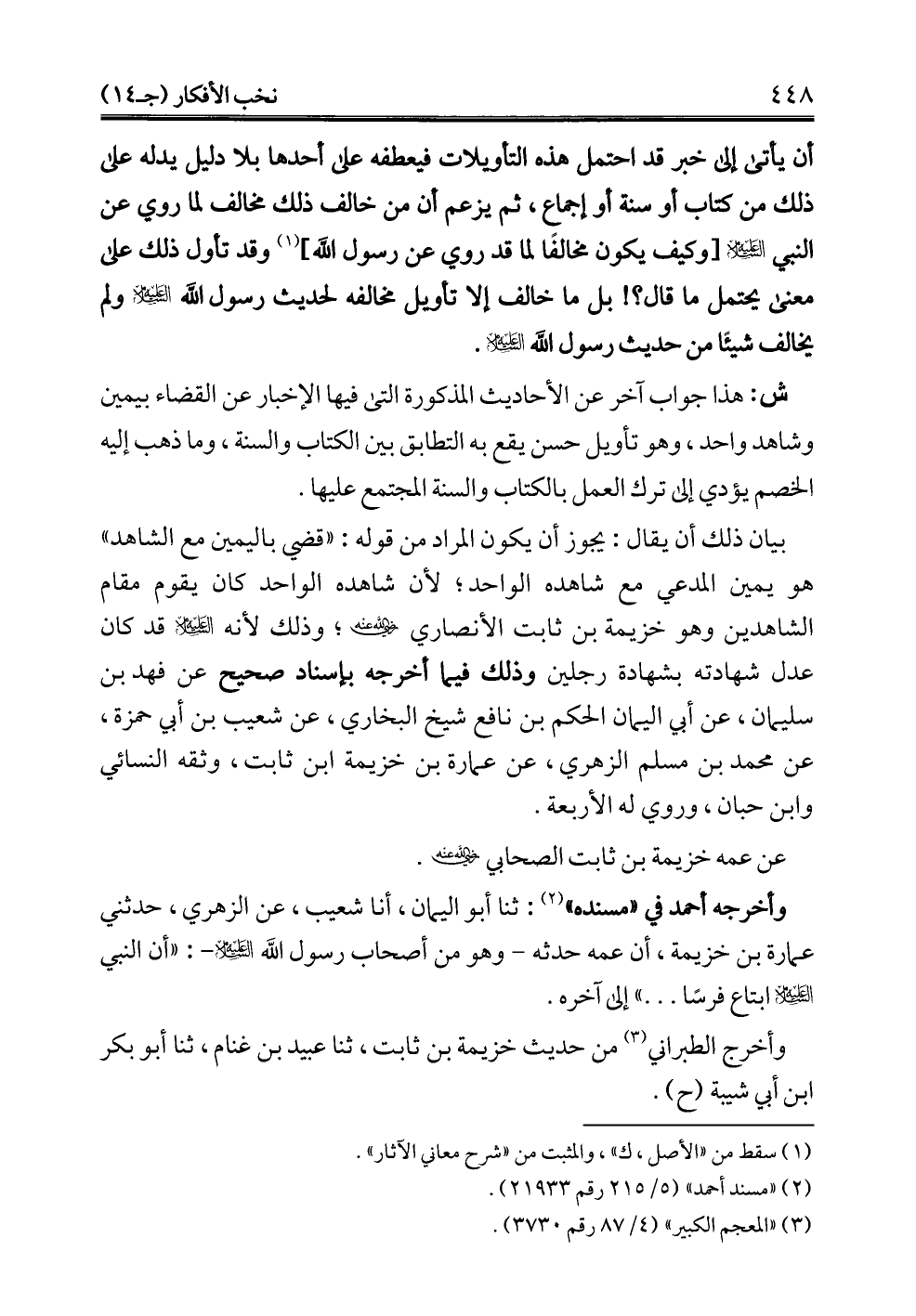 ش: هذا جواب آخر عن الأحاديث المذكورة التي فيها الإخبار عن القضاء بيمين وشاهد واحد، وهو تأويل حسن يقع به التطابق بين الكتاب والسنة، وما ذهب إليه الخصم يؤدي إلى ترك العمل بالكتاب والسنة المجتمع عليها.