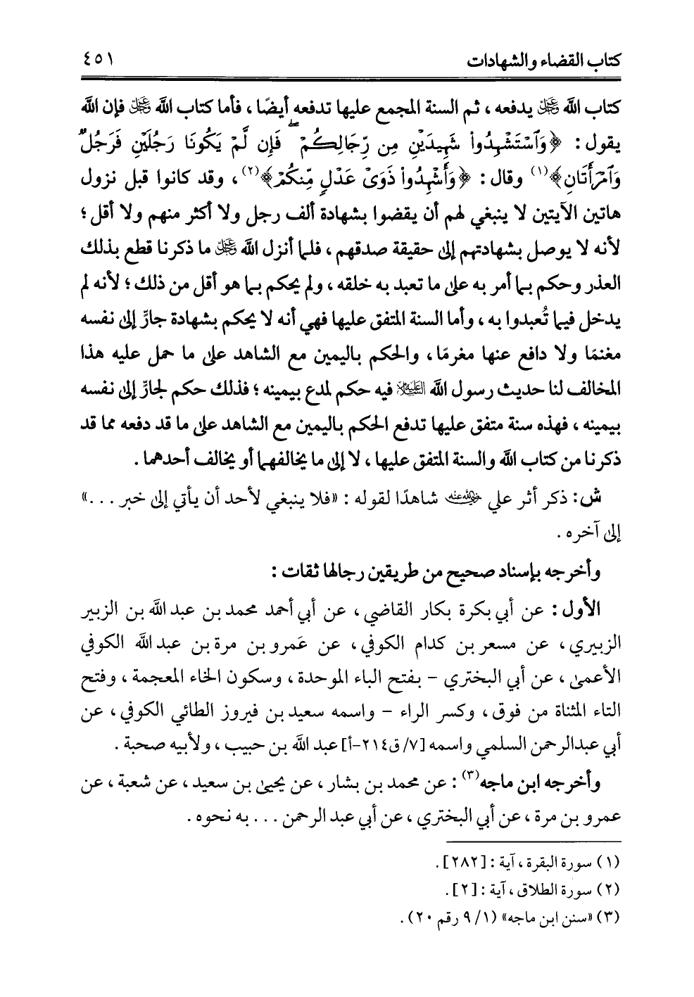 كتاب الله -عز وجل- لدفعه، ثم السنة المجمع عليها تدفعه أيضًا، فأما كتاب الله -عز وجل- فإن الله يقول: {وَاسْتَشْهِدُوا شَهِيدَيْنِ مِنْ رِجَالِكُمْ فَإِنْ لَمْ يَكُونَا رَجُلَيْنِ فَرَجُلٌ وَامْرَأَتَانِ} (¬1) وقال: {وَأَشْهِدُوا ذَوَيْ عَدْلٍ مِنْكُمْ} (¬2)، وقد كانوا قبل نزول هاتين الآيتين لا ينبغي لهم أن يقضوا بشهادة ألف رجل ولا أكثر منهم ولا أقل؛ لأنه لا يوصل بشهادتهم إلى حقيقة صدقهم، فلما أنزل الله -عز وجل- ما ذكرنا قطع بذلك العذر وحكم بما أمر به على ما تعبد به خلقه، ولم يحكم بما هو أقل من ذلك؛ لأنه لم يدخل فيما تُعبدوا به، وأما السنة المتفق عليها فهي أنه لا يحكم بشهادة جارٍّ إلى نفسه مغنمًا ولا دافع عنها مغرمًا، والحكم باليمين مع الشاهد على ما حمل عليه هذا المخالف لنا حديث رسول الله -عليه السلام- فيه حكم لمدع بيمينه؛ فذلك حكم لجارٍّ إلى نفسه بيمينه، فهذه سنة متفق عليها تدفع الحكم باليمين مع الشاهد على ما قد دفعه مما قد ذكرنا من كتاب الله والسنة المتفق عليها، لا إلى ما يخالفهما أو يخالف أحدهما.