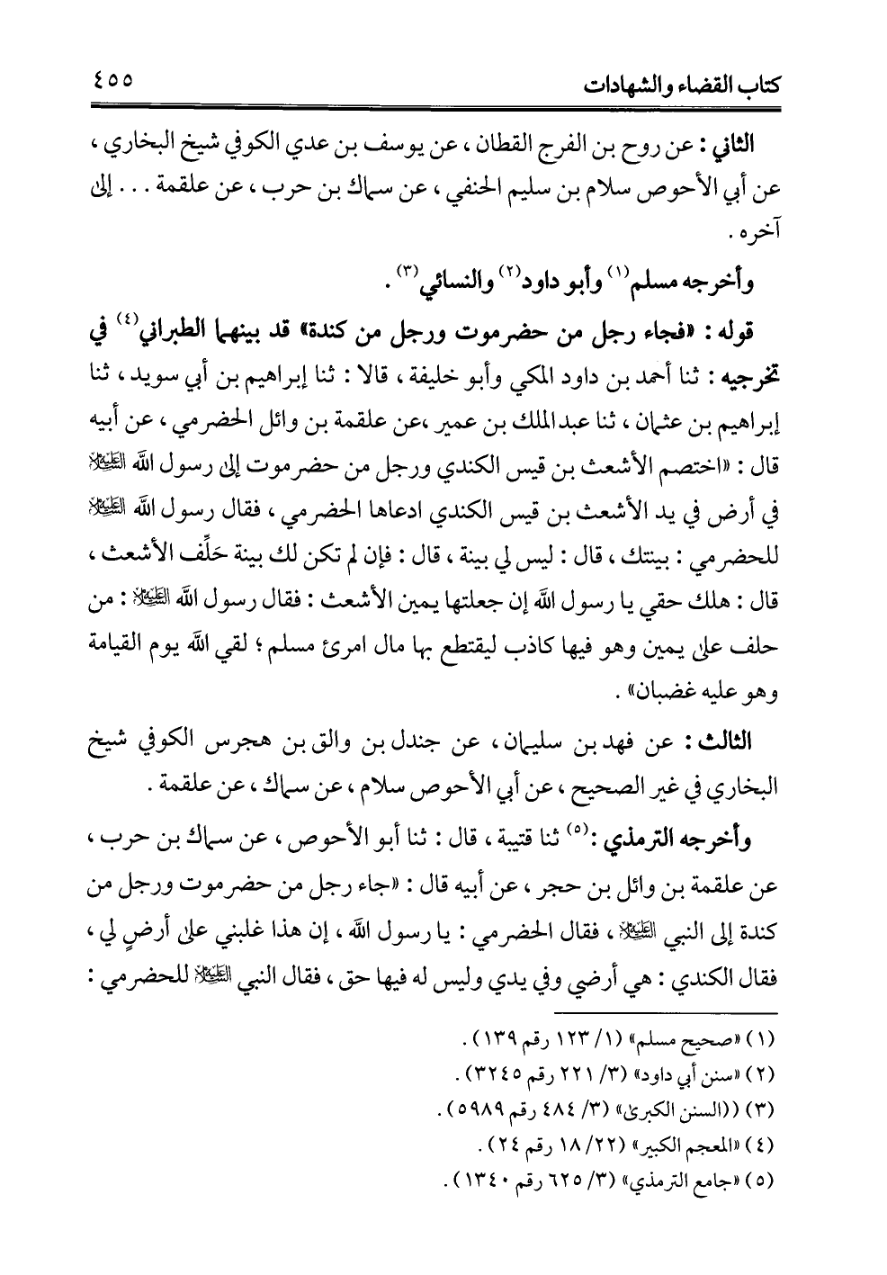 وأخرجه الترمذي: (¬5) ثنا قتيبة، قال: ثنا أبو الأحوص، عن سماك بن حرب، عن علقمة بن وائل بن حجر، عن أبيه قال: "جاء رجل من حضرموت ورجل من كندة إلى النبي -عليه السلام-، فقال الحضرمي: يا رسول الله، إن هذا غلبني على أرضٍ لي، فقال الكندي: هي أرضي وفي يدي وليس له فيها حق، فقال النبي -عليه السلام- للحضرمي: