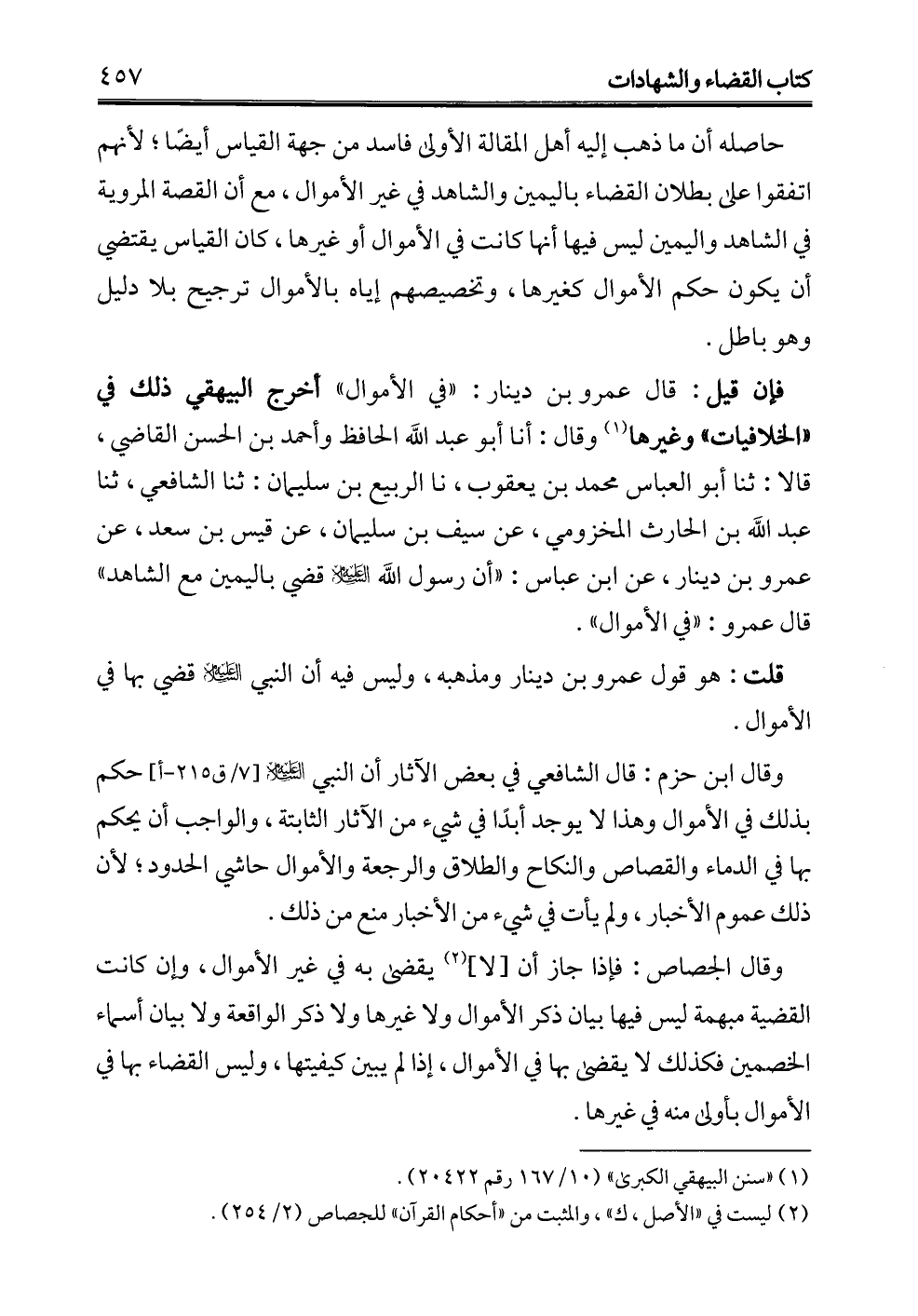 حاصله أن ما ذهب إليه أهل المقالة الأولى فاسد من جهة القياس أيضًا؛ لأنهم اتفقوا على بطلان القضاء باليمين والشاهد في غير الأموال، مع أن القصة المروية في الشاهد واليمين ليس فيها أنها كانت في الأموال أو غيرها، كان القياس يقتضي أن يكون حكم الأموال كغيرها، وتخصيصهم إياه بالأموال ترجيح بلا دليل وهو باطل.