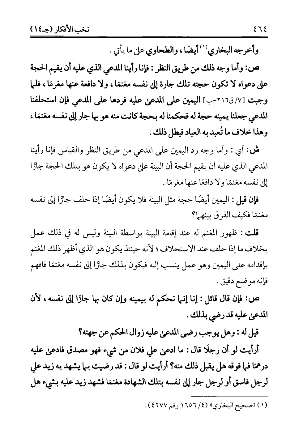 ص: وأما وجه ذلك من طريق النظر: فإنا رأينا المدعي الذي عليه أن يقيم الحجة على دعواه لا تكون حجته تلك جارة إلى نفسه مغنمًا، ولا دافعة عنها مغرمًا، فلما وجبت اليمين على المدعى عليه فردها على المدعي فإن استحلفنا المدعي جعلنا يمينه حجة له فحكمنا له بحجة كانت منه هو بها جار إلى نفسه مغنمًا، وهذا خلاف ما تُعبد به العباد فبطل ذلك.