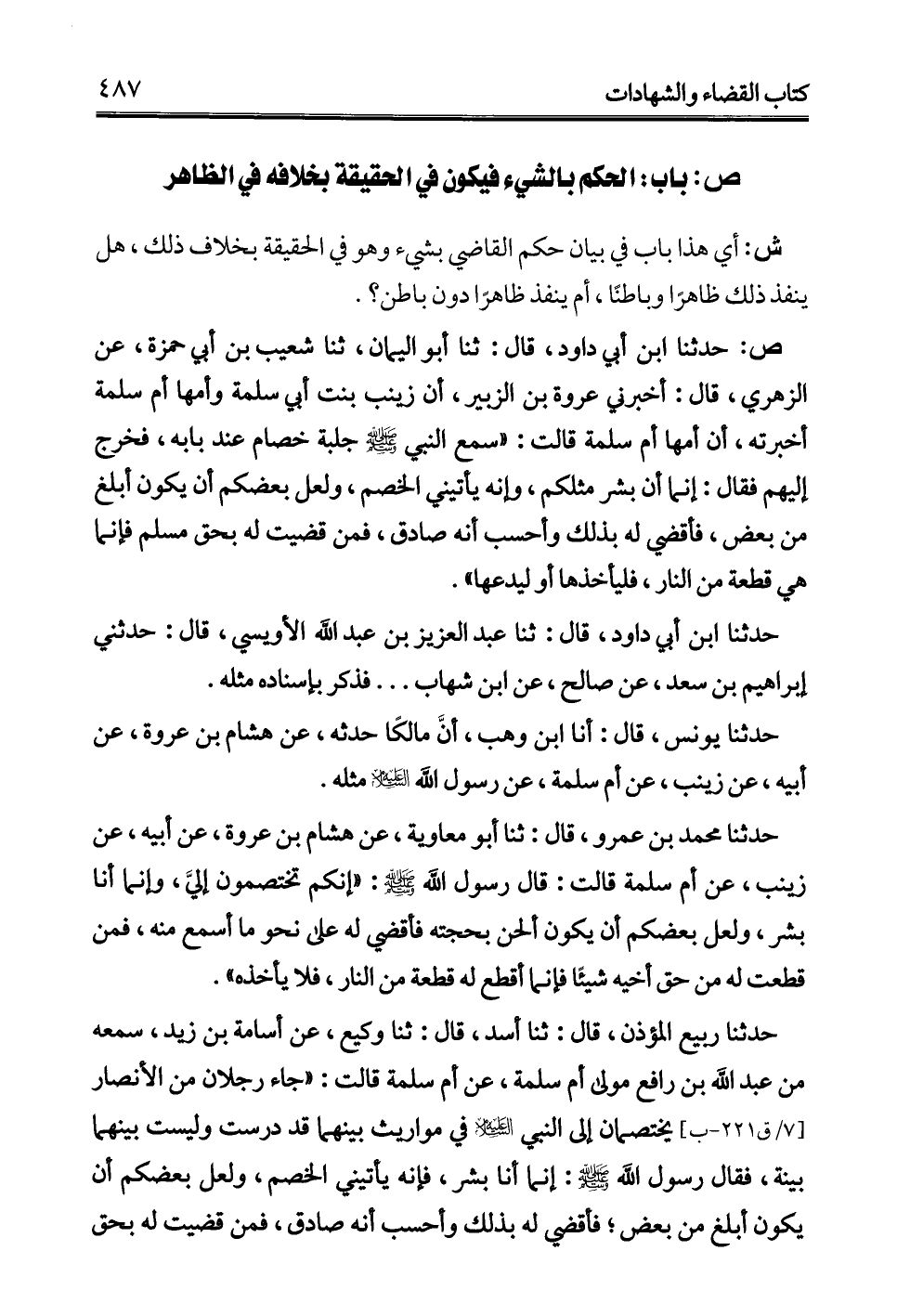 حدثنا ربيع المؤذن، قال: ثنا أسد، قال: ثنا وكيع، عن أسامة بن زيد، سمعه من عبد الله بن رافع مولى أم سلمة، عن أم سلمة قالت: "جاء رجلان من الأنصار يختصمان إلى النبي -عليه السلام- في مواريث بينهما قد درست وليست بينهما بينة، فقال رسول الله - صلى الله عليه وسلم -: إنما أنا بشر، فإنه يأتيني الخصم، ولعل بعضكم أن يكون أبلغ من بعض؛ فأقضي له بذلك وأحسب أنه صادق، فمن قضيت له بحق