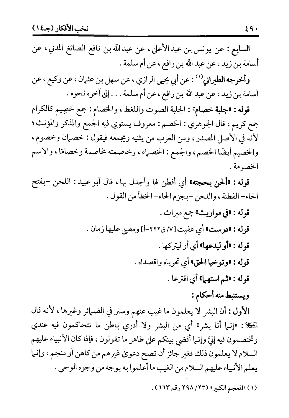 الأول: أن البشر لا يعلمون ما غيب عنهم وستر في الضمائر وغيرها، لأنه قال -عليه السلام-: "إنما أنا بشر" أي من البشر ولا أدري باطن ما تتحاكمون فيه عندي وتختصمون فيه إليَّ وإنما أقضي بينكم على ظاهر ما تقولون، فإذا كان الأنبياء عليهم السلام لا يعلمون ذلك فغير جائز أن تصح دعوى غيرهم من كاهن أو منجم، وإنما يعلم الأنبياء -عليهم السلام- من الغيب ما أعلموا به بوجه من وجوه الوحي.