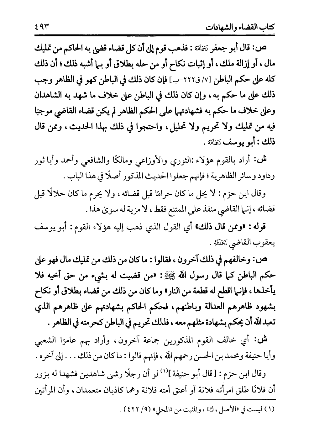 ص: قال أبو جعفر -رحمه الله-: فذهب قوم إلى أن كل قضاء قضى به الحاكم من تمليك مال، أو إزالة ملك، أو إثبات نكاح أو من حله بطلاق أو بما أشبه ذلك؛ أن ذلك كله على حكم الباطن فإن كان ذلك في الباطن كهو في الظاهر وجب ذلك على ما حكم به، وإن كان ذلك في الباطن على خلاف ما شهد به الشاهدان وعلى خلاف ما حكم به فشهادتهما على الحكم الظاهر لم يكن قضاء القاضي موجبًا فيه من تمليك ولا تحريم ولا تحليل، واحتجوا في ذلك بهذا الحديث، وممن قال ذلك: أبو يوسف -رحمه الله-.