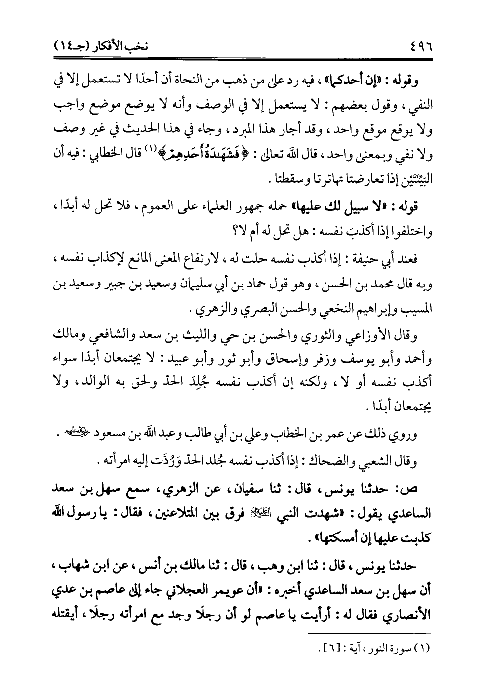 ص: حدثنا يونس، قال: ثنا سفيان، عن الزهري، سمع سهل بن سعد الساعدي يقول: "شهدت النبي -عليه السلام- فرق بين المتلاعنين، فقال: يا رسول الله كذبت عليها إن أمسكتها".
