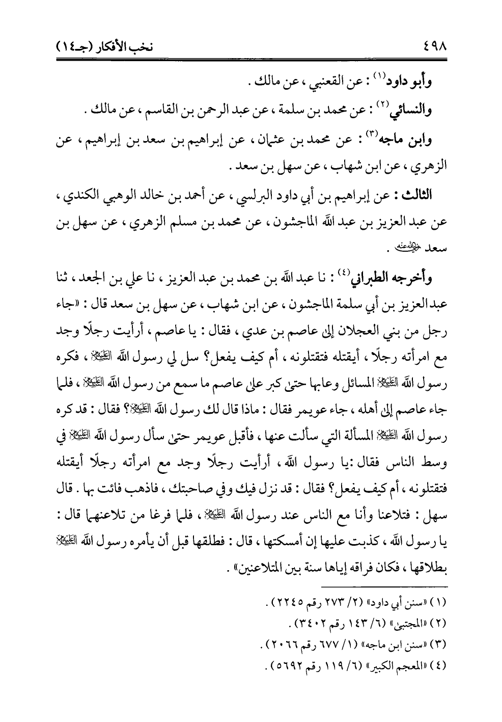 وأخرجه الطبراني (¬4): نا عبد الله بن محمَّد بن عبد العزيز، نا علي بن الجعد، ثنا عبد العزيز بن أبي سلمة الماجشون، عن ابن شهاب، عن سهل بن سعد قال: "جاء رجل من بني العجلان إلى عاصم بن عدي، فقال: يا عاصم، أرأيت رجلًا وجد مع امرأته رجلًا، أيقتله فتقتلونه، أم كيف يفعل؟ سل لي رسول الله -عليه السلام-، فكره رسول الله -عليه السلام- المسائل وعابها حتى كبر على عاصم ما سمع من رسول الله -عليه السلام-، فلما جاء عاصم إلى أهله، جاء عويمر فقال: ماذا قال لك رسول الله -عليه السلام-؟ فقال: قد كره رسول الله -عليه السلام- المسألة التي سألت عنها، فأقبل عويمر حتى سأل رسول الله -عليه السلام- في وسط الناس فقال: يا رسول الله، أرأيت رجلًا وجد مع امرأته رجلًا أيقتله فتقتلونه، أم كيف يفعل؟ فقال: قد نزل فيك وفي صاحبتك، فاذهب فائت بها. قال سهل: فتلاعنا وأنا مع الناس عند رسول الله -عليه السلام-، فلما فرغا من تلاعنهما قال: يا رسول الله، كذبت عليها إن أمسكتها، قال: فطلقها قبل أن يأمره رسول الله -عليه السلام- بطلاقها، فكان فراقه إياها سنة بين المتلاعنين".
