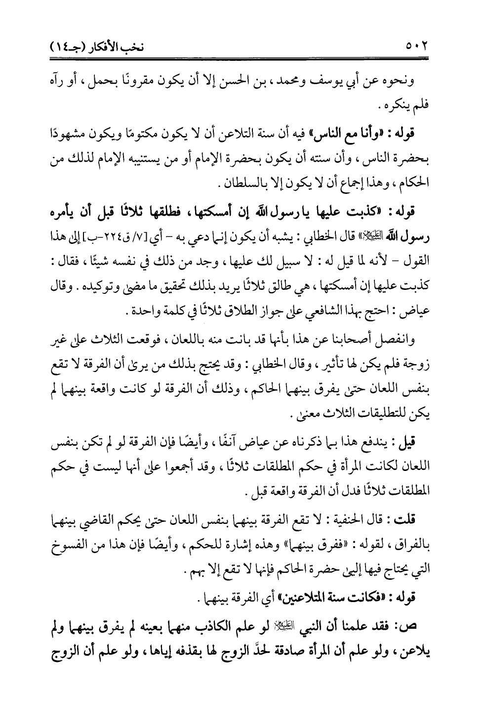 قيل: يندفع هذا بما ذكرناه عن عياض آنفًا، وأيضًا فإن الفرقة لو لم تكن بنفس اللعان لكانت المرأة في حكم المطلقات ثلاثًا، وقد أجمعوا على أنها ليست في حكم المطلقات ثلاثًا فدل أن الفرقة واقعة قبل.