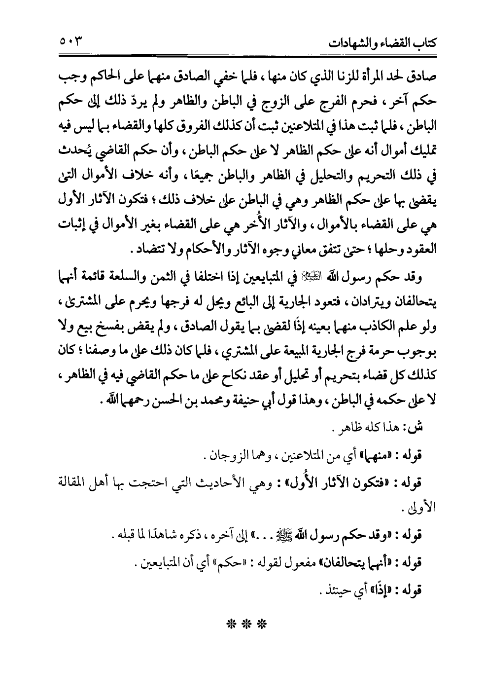 وقد حكم رسول الله -عليه السلام- في المتبايعين إذا اختلفا في الثمن والسلعة قائمة أنهما يتحالفان ويترادان، فتعود الجارية إلى البائع ويحل له فرجها ويحرم على المشترى، ولو علم الكاذب منهما بعينه إذًا لقضى بما يقول الصادق، ولم يقض بفسخ بيع ولا بوجوب حرمة فرج الجارية المبيعة على المشتري، فلما كان ذلك على ما وصفنا؛ كان كذلك كل قضاء بتحريم أو تحليل أو عقد نكاح على ما حكم القاضي فيه في الظاهر، لا على حكمه في الباطن، وهذا قول أبي حنيفة ومحمد بن الحسن -رحمهما الله-.