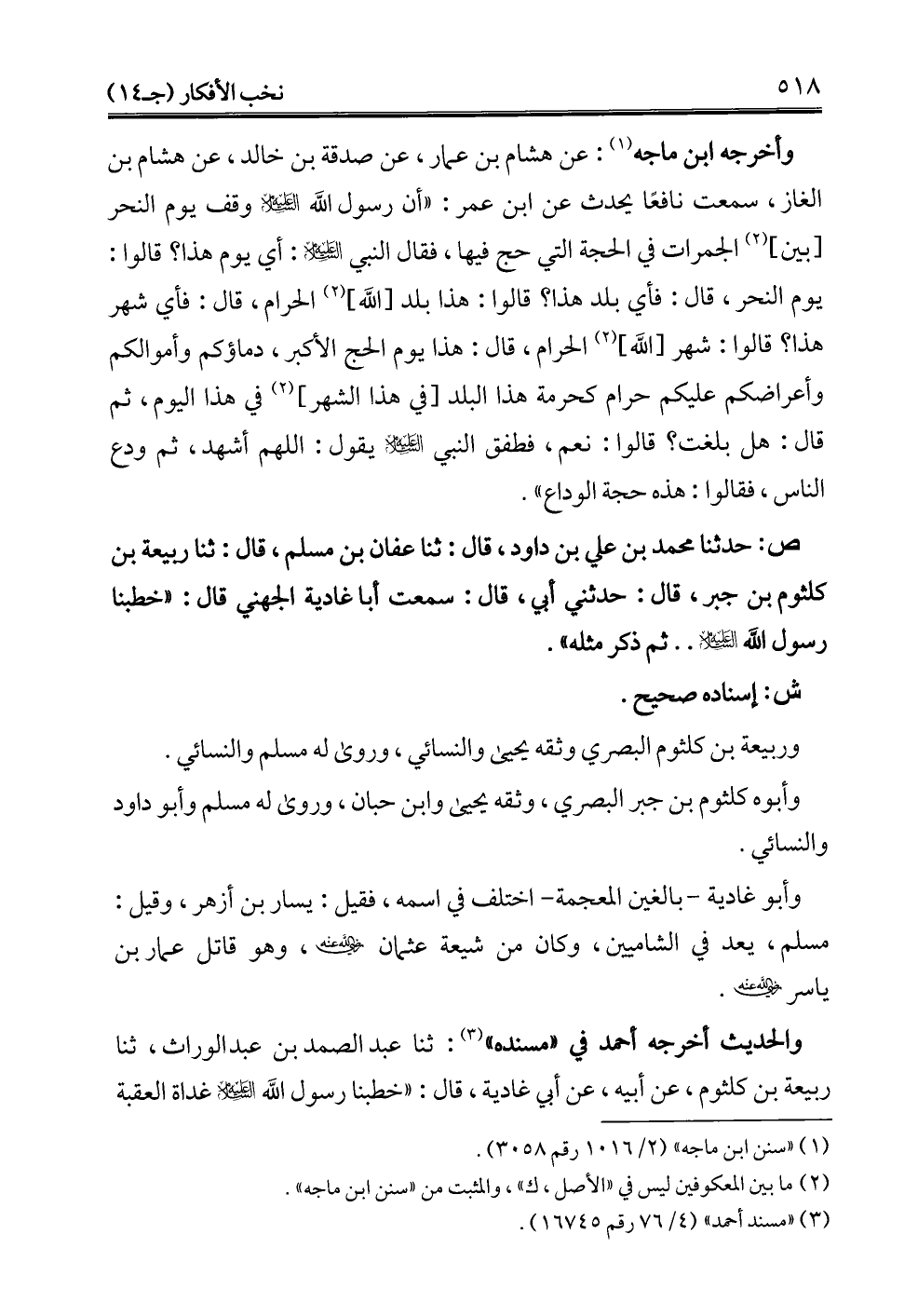 وأخرجه ابن ماجه (¬1): عن هشام بن عمار، عن صدقة بن خالد، عن هشام بن الغاز، سمعت نافعًا يحدث عن ابن عمر: "أن رسول الله -عليه السلام- وقف يوم النحر [بين] (¬2) الجمرات في الحجة التي حج فيها، فقال النبي -عليه السلام-: أي يوم هذا؟ قالوا: يوم النحر، قال: فأي بلد هذا؟ قالوا: هذا بلد [الله] (2) الحرام، قال: فأي شهر هذا؟ قالوا: شهر [الله] (2) الحرام، قال: هذا يوم الحج الأكبر، دماؤكم وأموالكم وأعراضكم عليكم حرام كحرمة هذا البلد [في هذا الشهر] (2) في هذا اليوم، ثم قال: هل بلغت؟ قالوا: نعم، فطفق النبي -عليه السلام- يقول: اللهم أشهد، ثم ودع الناس، فقالوا: هذه حجة الوداع".