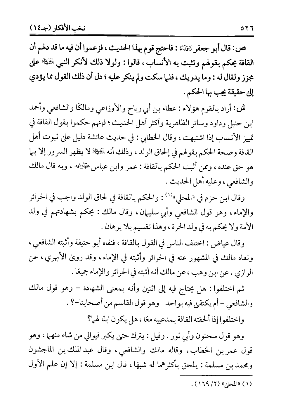 ص: قال أبو جعفر -رحمه الله-: فاحتج قوم بهذا الحديث، فزعموا أن فيه ما قد دلهم أن القافة يحكم بقولهم وتثبت به الأنساب، قالوا: ولولا ذلك لأنكر النبي -عليه السلام- على مجزز ولقال له: وما يدريك، فلما سكت ولم ينكر عليه؛ دل أن ذلك القول مما يؤدي إلى حقيقة يجب بها الحكم.