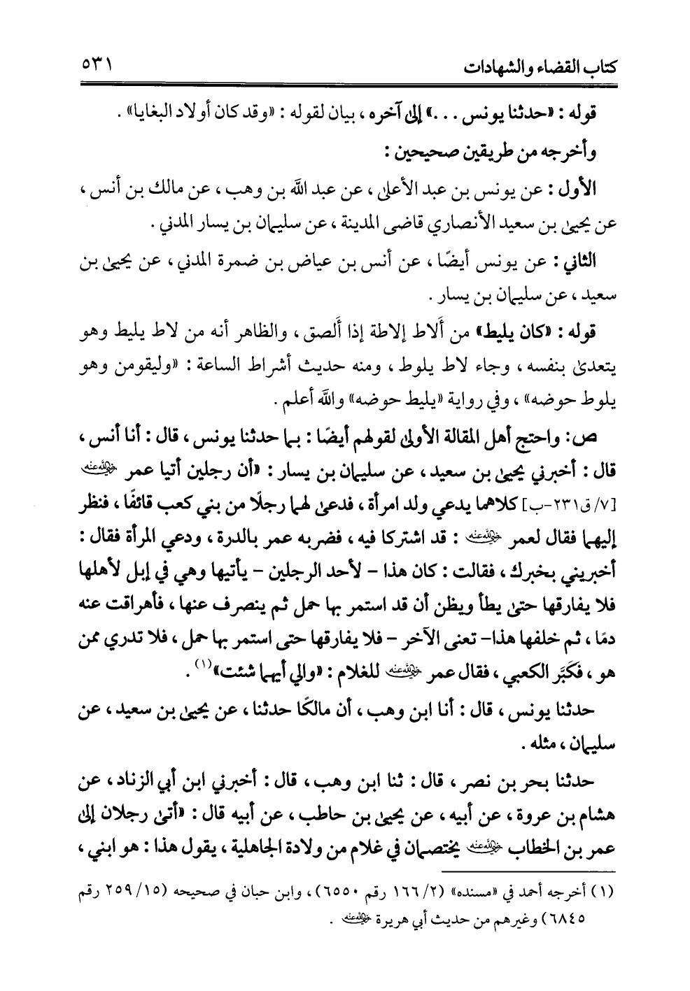 حدثنا بحر بن نصر، قال: ثنا ابن وهب، قال: أخبرني ابن أبي الزناد، عن هشام بن عروة، عن أبيه، عن يحيى بن حاطب، عن أبيه قال: "أتى رجلان إلى عمر بن الخطاب -رضي الله عنه - يختصمان في غلام من ولادة الجاهلية، يقول هذا: هو ابني،