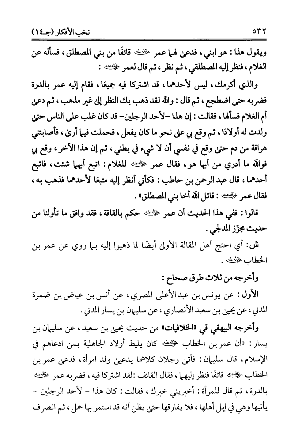 ويقول هذا: هو ابني، فدعى لهما عمر -رضي الله عنه - قائفًا من بني المصطلق، فسأله عن الغلام، فنظر إليه المصطلقي، ثم نظر، ثم قال لعمر -رضي الله عنه -: