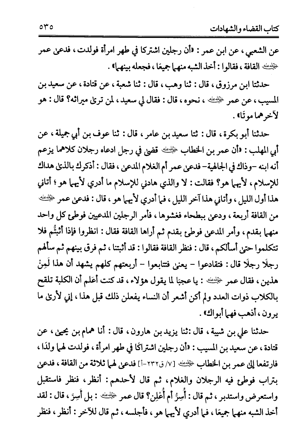 حدثنا علي بن شيبة، قال: ثنا يزيد بن هارون، قال: أنا همام بن يحيى، عن قتادة، عن سعيد بن المسيب: "أن رجلين اشتركا في طهر امرأة، فولدت لهما ولدًا، فارتفعا إلى عمر بن الخطاب - رضي الله عنه - فدعى لهما ثلاثة من القافة، فدعى بتراب فوطئ فيه الرجلان والغلام، ثم قال لأحدهم: انظر، فنظر فاستقبل واستعرض واستدبر، ثم قال: أُسِرُّ أم أُعْلِن؟ قال عمر - رضي الله عنه -: بل أَسِرَّ، قال: لقد أخذ الشبه منهما جميعًا، فما أدري لأيهما هو، فأجلسه، ثم قال للآخر: انظر، فنظر