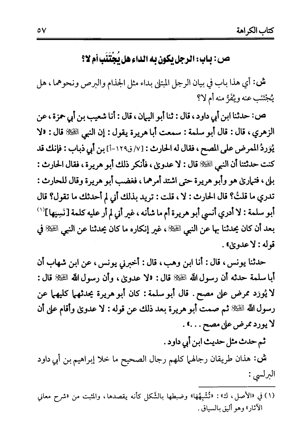 حدثنا يونس، قال: أنا ابن وهب، قال: أخبرني يونس، عن ابن شهاب أن أبا سلمة حدثه أن رسول الله -عليه السلام- قال: "لا عدوى، وأن رسول الله -عليه السلام- قال: لا يُورَد ممرض علي مصح. قال أبو سلمة: كان أبو هريرة يحدثهما كليهما عن رسول الله -عليه السلام- ثم صمت أبو هريرة بعد ذلك عن قوله: لا عدوى وأقام علي أن لا يورد ممرض علي مصح. . . .".