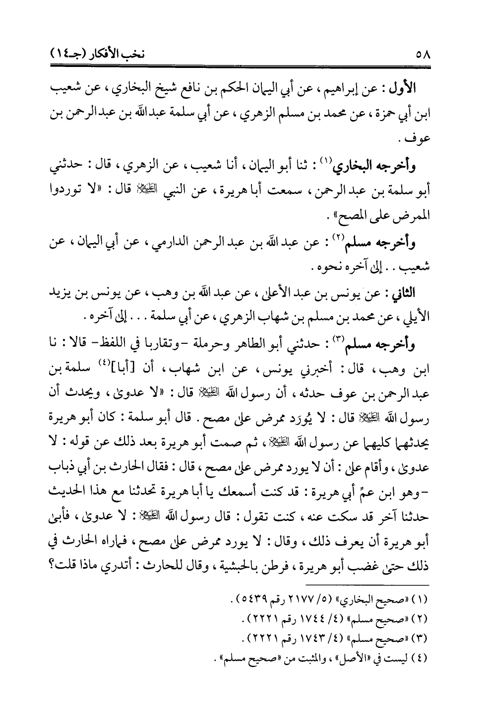 وأخرجه البخاري (¬1): ثنا أبو اليمان، أنا شعيب، عن الزهري، قال: حدثني أبو سلمة بن عبد الرحمن، سمعت أبا هريرة، عن النبي -عليه السلام- قال: "لا توردوا الممرض على المصح".