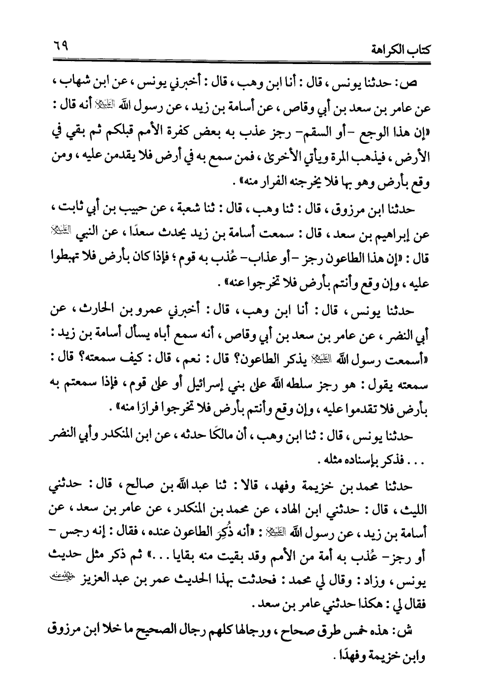 حدثنا يونس، قال: أنا ابن وهب، قال: أخبرني عمرو بن الحارث، عن أبي النضر، عن عامر بن سعد بن أبي وقاص، أنه سمع أباه يسأل أسامة بن زيد: "أسمعت رسول الله -عليه السلام- يذكر الطاعون؟ قال: نعم، قال: كيف سمعته؟ قال: سمعته يقول: هو رجز سلطه الله علي بني إسرائيل أو علي قوم، فإذا سمعتم به بأرض فلا تقدموا عليه، وإن وقع وأنتم بأرض فلا تخرجوا فرارًا منه".