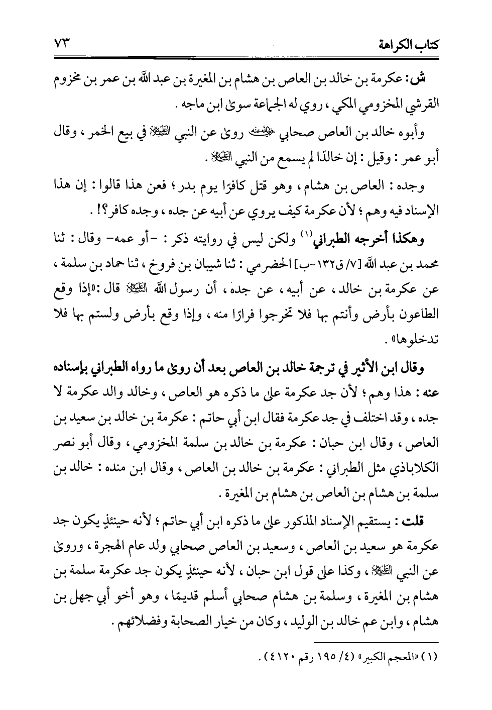 قلت: يستقيم الإسناد المذكور علي ما ذكره ابن أبي حاتم؛ لأنه حينئذٍ يكون جد عكرمة هو سعيد بن العاص، وسعيد بن العاص صحابي ولد عام الهجرة، وروي عن النبي -عليه السلام-، وكذا علي قول ابن حبان , لأنه حينئذٍ يكون جد عكرمة سلمة بن هشام بن المغيرة، وسلمة بن هشام صحابي أسلم قديمًا، وهو أخو أبي جهل بن هشام، وابن عم خالد بن الوليد، وكان من خيار الصحابة وفضلائهم.