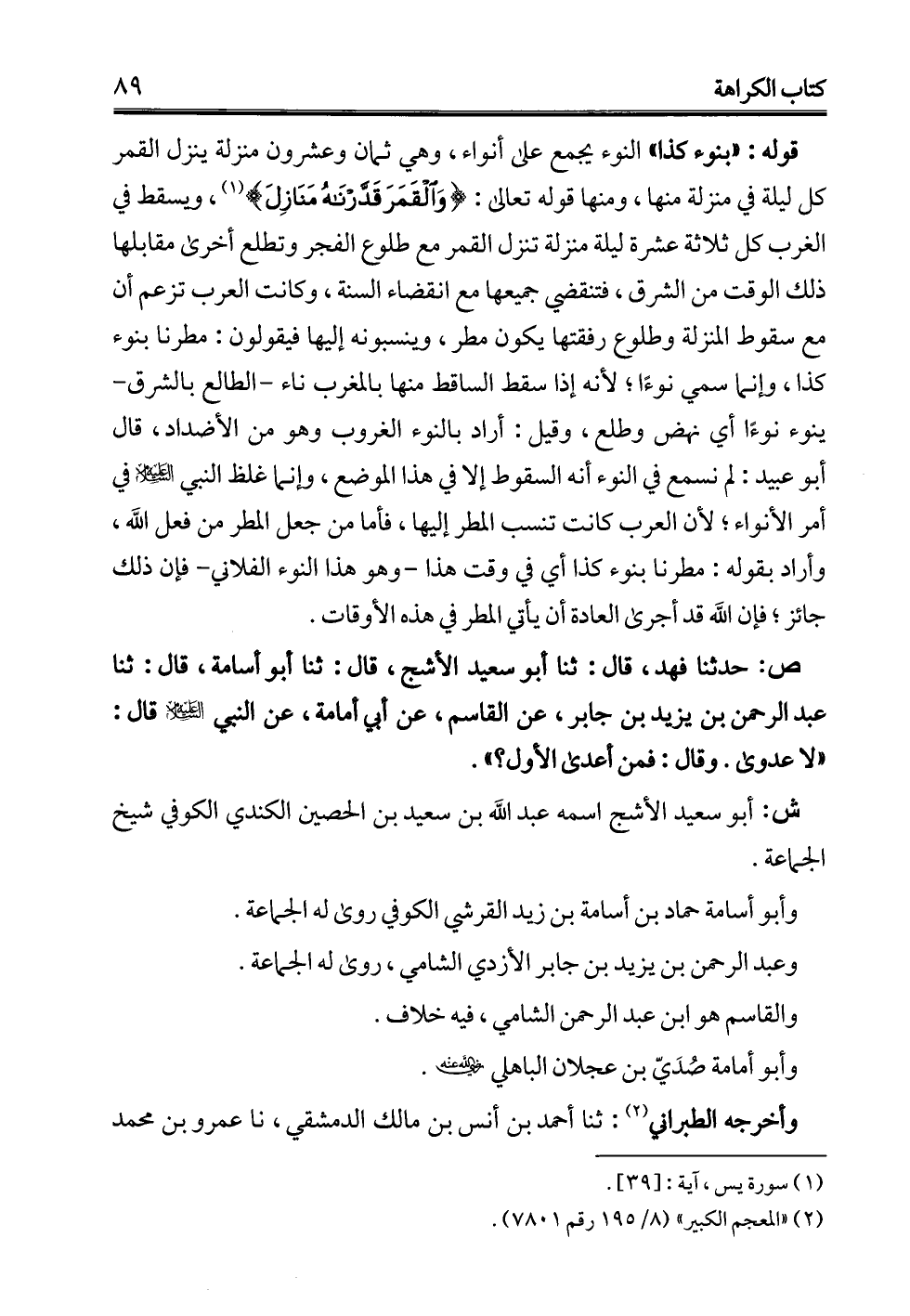 قوله: "بنوء كذا" النوء يجمع علي أنواء، وهي ثمان وعشرون منزلة ينزل القمر كل ليلة في منزلة منها، ومنها قوله تعالى: {وَالْقَمَرَ قَدَّرْنَاهُ مَنَازِلَ} (¬1)، ويسقط في الغرب كل ثلاثة عشرة ليلة منزلة تنزل القمر مع طلوع الفجر وتطلع أخرى مقابلها ذلك الوقت من الشرق، فتنقضي جميعها مع انقضاء السنة، وكانت العرب تزعم أن مع سقوط المنزلة وطلوع رفقتها يكون مطر، وينسبونه إليها فيقولون: مطرنا بنوء كذا، وإنما سمي نوءًا؛ لأنه إذا سقط الساقط منها بالمغرب ناء -الطالع بالشرق- ينوء نوءًا أي نهض وطلع، وقيل: أراد بالنوء الغروب وهو من الأضداد، قال أبو عبيد: لم نسمع في النوء أنه السقوط إلا في هذا الموضع، وإنما غلظ النبي -عليه السلام- في أمر الأنواء؛ لأن العرب كانت تنسب المطر إليها، فأما من جعل المطر من فعل الله، وأراد بقوله: مطرنا بنوء كذا أي في وقت هذا -وهو هذا النوء الفلاني- فإن ذلك جائز؛ فإن الله قد أجرى العادة أن يأتي المطر في هذه الأوقات.