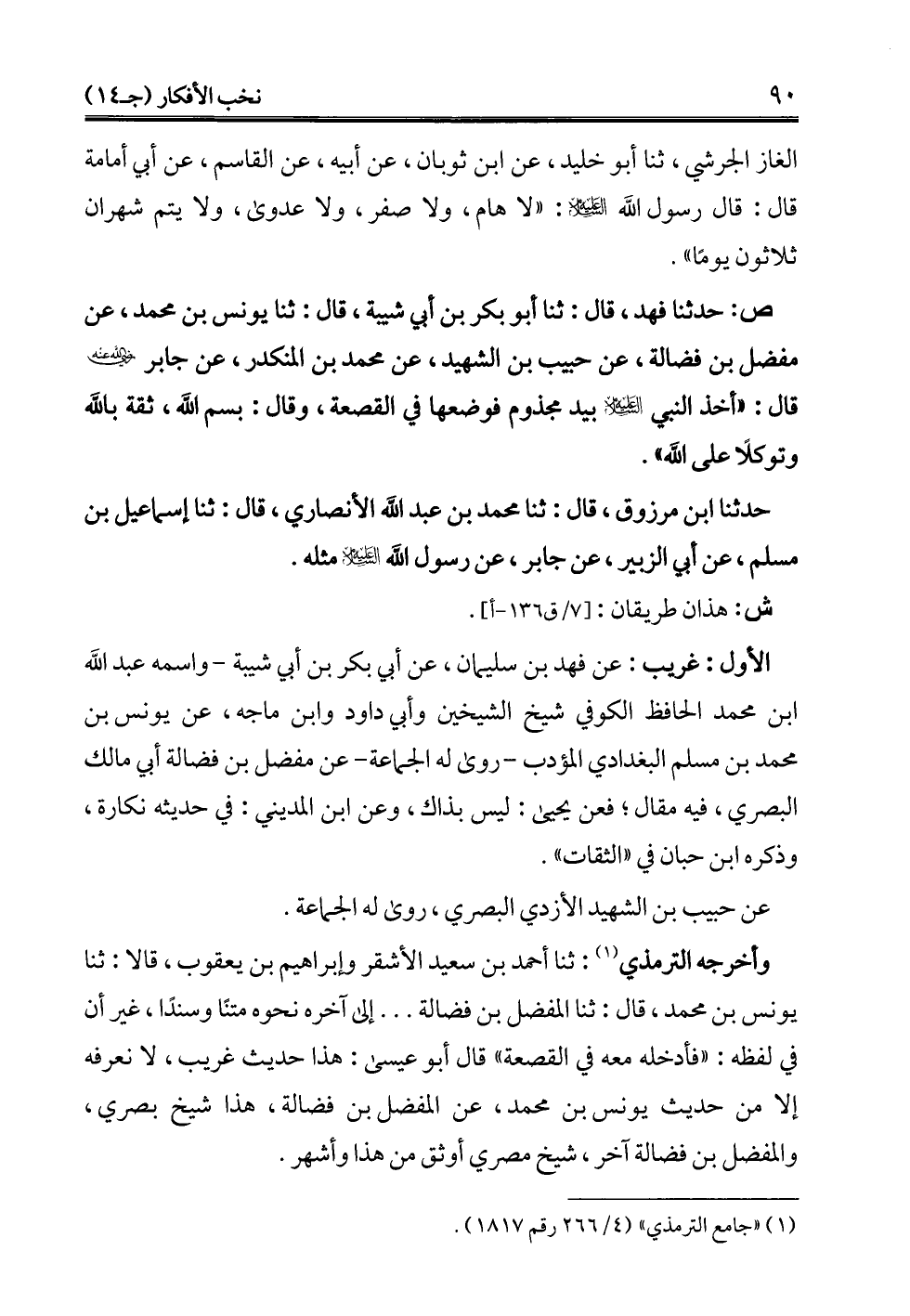 ص: حدثنا فهد، قال: ثنا أبو بكر بن أبي شيبة، قال: ثنا يونس بن محمَّد، عن مفضل بن فضالة، عن حبيب بن الشهيد، عن محمد بن المنكدر، عن جابر - رضي الله عنه - قال: "أخد النبي -عليه السلام- بيد مجذوم فوضعها في القصعة، وقال: بسم الله، ثقة بالله وتوكلًا على الله".