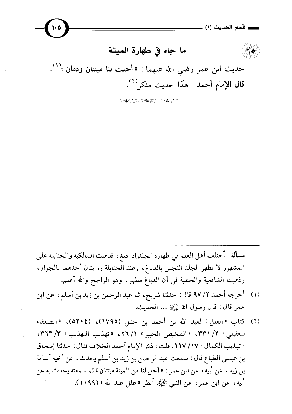 حديث ابن عمر رضي اللَّه عنهما: "أحلت لنا ميتتان ودمان" (¬1)
