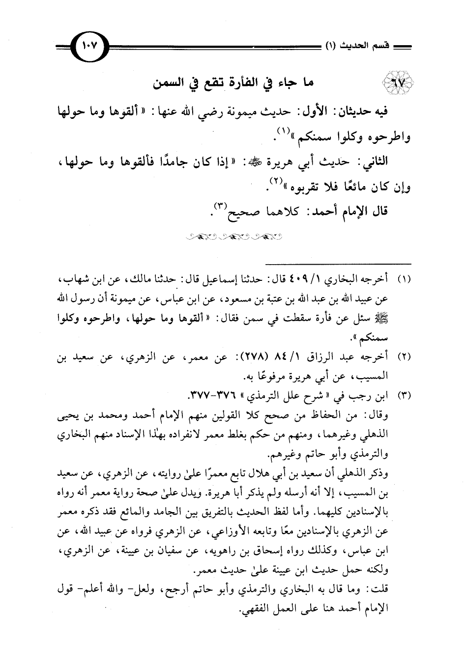 (¬1) أخرجه البخاري 1/ 409 قال: حدثنا إسماعيل قال: حدثنا مالك، عن ابن شهاب، عن عبيد اللَّه بن عبد اللَّه بن عتبة بن مسعود، عن ابن عباس، عن ميمونة أن رسول اللَّه -صلى اللَّه عليه وسلم- سئل عن فأرة سقطت في سمن فقال: "ألقوها وما حولها، واطرحوه وكلوا سمنكم".