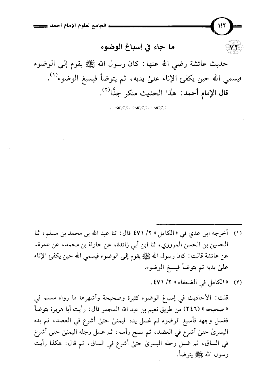 (¬1) أخرجه ابن عدي في "الكامل" 2/ 471 قال: ثنا عبد اللَّه بن محمد بن مسلم، ثنا الحسين بن الحسن المروزي، ثنا ابن أبي زائدة، عن حارثة بن محمد، عن عمرة، عن عائشة قالت: كان رسول اللَّه -صلى اللَّه عليه وسلم- يقوم إلى الوضوء فيسمي اللَّه حين يكفئ الإناء على يديه ثم يتوضأ فيسبغ الوضوء.
