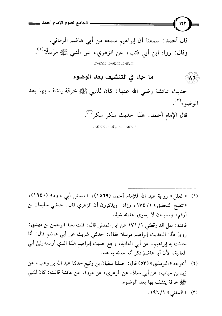 (¬2) أخرجه "الترمذي" (53) قال: حدثنا سفيان بن وكيع حدثنا عبد اللَّه بن وهب، عن زيد بن حباب، عن أبي معاذ، عن الزهري، عن عروة، عن عائشة قالت: كان للنبي -صلى اللَّه عليه وسلم- خرقة ينشف بها بعد الوضوء.