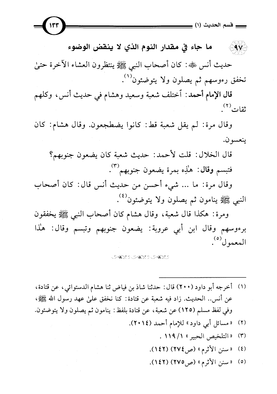 (¬1) أخرجه أبو داود (200) قال: حدثنا شاذ بن فياض ثنا هشام الدستوائي، عن قتادة، عن أنس. . الحديث. زاد فيه شعبة عن قتادة: كنا نخفق على عهد رسول اللَّه -صلى اللَّه عليه وسلم-، وفي لفظ مسلم (125) عن شعبة، عن قتادة بلفظ: ينامون ثم يصلون ولا يتوضئون.