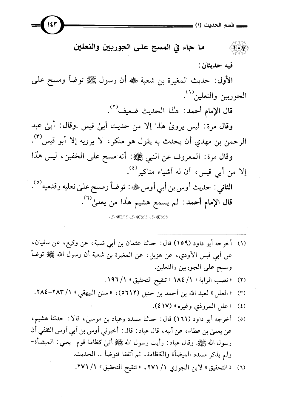 (¬1) أخرجه أبو داود (159) قال: حدثنا عثمان بن أبي شيبة، عن وكيع، عن سفيان، عن أبي قيس الأودي، عن هزيل، عن المغيرة بن شعبة أن رسول اللَّه -صلى اللَّه عليه وسلم- توضأ ومسح على الجوربين والنعلين.
