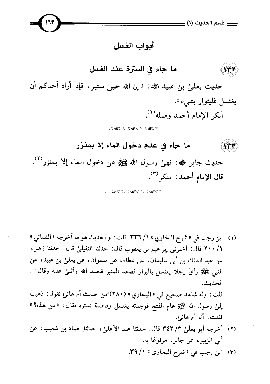 (¬1) ابن رجب في "شرح البخاري" 1/ 336. قلت: والحديث هو ما أخرجه "النسائي" 1/ 200 قال: أخبرنى إبراهيم بن يعقوب قال: حدثنا النفيلى قال: حدثنا زهير، عن عبد الملك بن أبي سليمان، عن عطاء، عن صفوان، عن يعلى بن عبيد، عن النبي -صلى اللَّه عليه وسلم- رأى رجلا يغتسل بالبراز فصعد المنبر فحمد اللَّه وأثنى عليه وقال: . . الحديث.