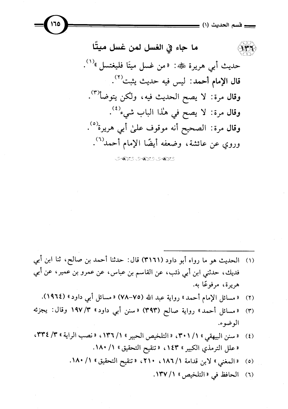 (¬4) "سنن البيهقي" 1/ 301، "التلخيص الحبير" 1/ 136، "نصب الراية" 3/ 334، "علل الترمذي الكبير" 143، "تنقيح التحقيق" 1/ 180.