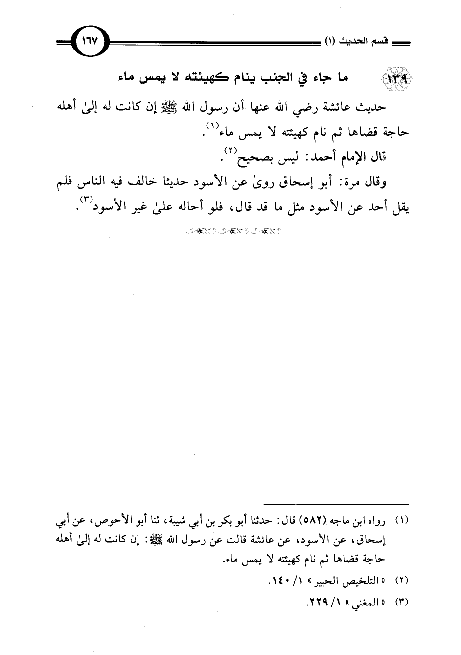 (¬1) رواه ابن ماجه (582) قال: حدثنا أبو بكر بن أبي شيبة، ثنا أبو الأحوص، عن أبي إسحاق، عن الأسود، عن عائشة قالت عن رسول اللَّه -صلى اللَّه عليه وسلم-: إن كانت له إلى أهله حاجة قضاها ثم نام كهيئته لا يمس ماء.