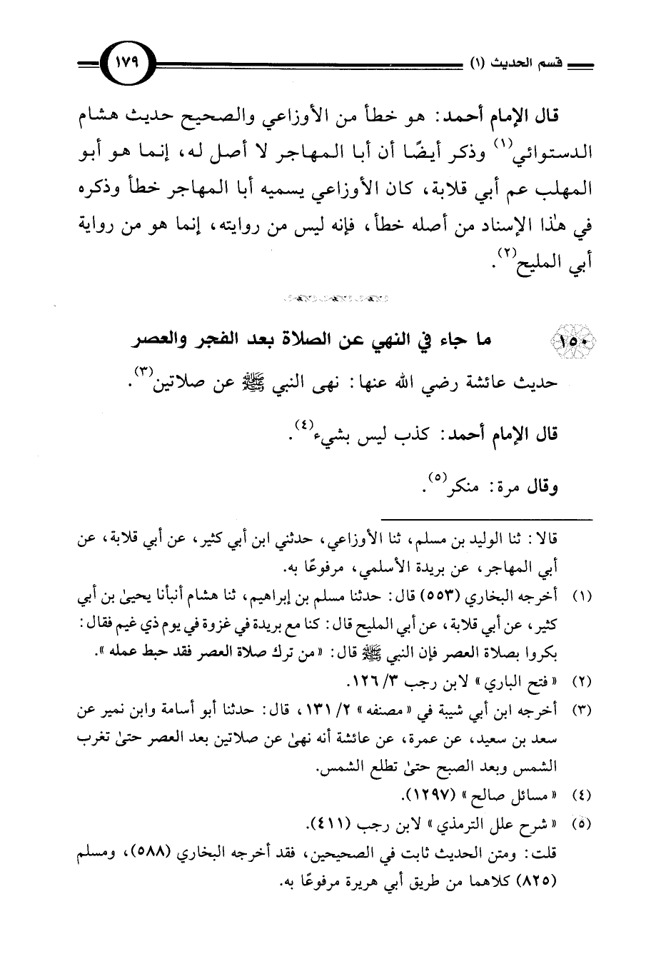 قال الإمام أحمد: هو خطأ من الأوزاعي والصحيح حديث هشام الدستوائي (¬1) وذكر أيضًا أن أبا المهاجر لا أصل له، إنما هو أبو المهلب عم أبي قلابة، كان الأوزاعي يسميه أبا المهاجر خطأ وذكره في هذا الإسناد من أصله خطأ، فإنه ليس من روايته، إنما هو من رواية أبي المليح (¬2).