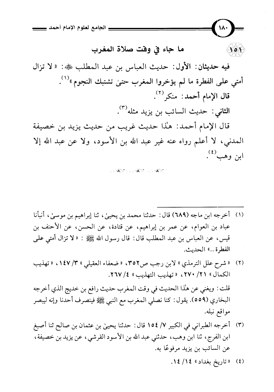 فيه حديثان: الأول: حديث العباس بن عبد المطلب: "لا تزال أمتي على الفطرة ما لم يؤخروا المغرب حتى تشتبك النجوم" (¬1).